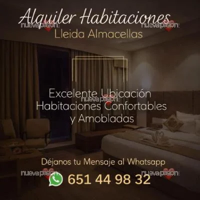 ALQUILER DE HABITACIONES EN ALMACELLESHabitaciones en, LLEIDA ALMACELLES llámanos para conseguir tu alojamiento con todas las comodidades en un entorno privilegiado donde tú tranquilidad y tabajo están asegurado chicas con ganas de trabajar estamos en una zona cerca de la playa y lugar de ocio y el mercado en pleno centro con mucho aparcamiento y este es tu sitioAlava, País Vasco, Albacete, Castilla-La Mancha, Alicante, Comunidad Valenciana, Almería, Asturias, Ávila, Badajoz, Barcelona, Burgos, Cáceres, Extremadura, Cádiz, Cantabria, Castellón, Ciudad Real, Córdoba, Cuenca, Gerona, Granada, Guadalajara, Guipúzcoa, Huelva, Huesca, Islas Baleares, Illes Balears, Jaén, La Coruña, A Coruña, Galicia, La Rioja, Las Palmas, Canarias, León, Lérida, Lleida, Cataluña, Catalunya, Lugo, Madrid, Málaga